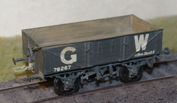 This is a model of an O11 5 plank open built from an ABS kit. It has DC III brake gear, a sheet supporter and GW self contained buffers.